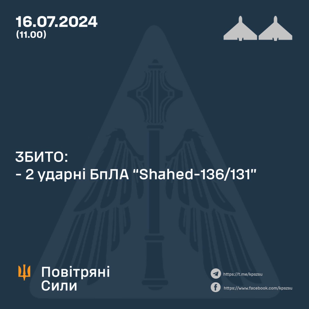 "Із вечора 15 липня та протягом доби 16 липня 2024 року протиповітряною обороною знищено два ударні БпЛА типу Shahed, ще два «Шахеди» локаційно втрачено у повітряному просторі Білорусі", - йдеться у дописі.