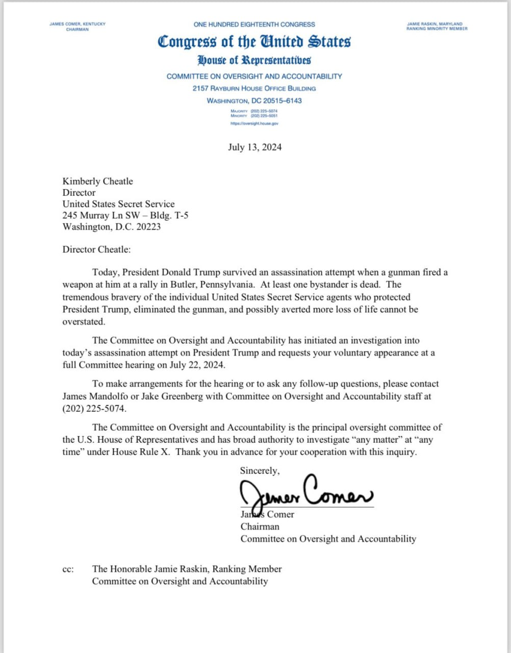 Керівник комітету Джеймс Комер опублікував копію листа до Чітл, в якій зазначає, що комітет ініціював розслідування замаху на Трампа та просить її добровільно з’явитися на засідання комітету у зазначену дату.