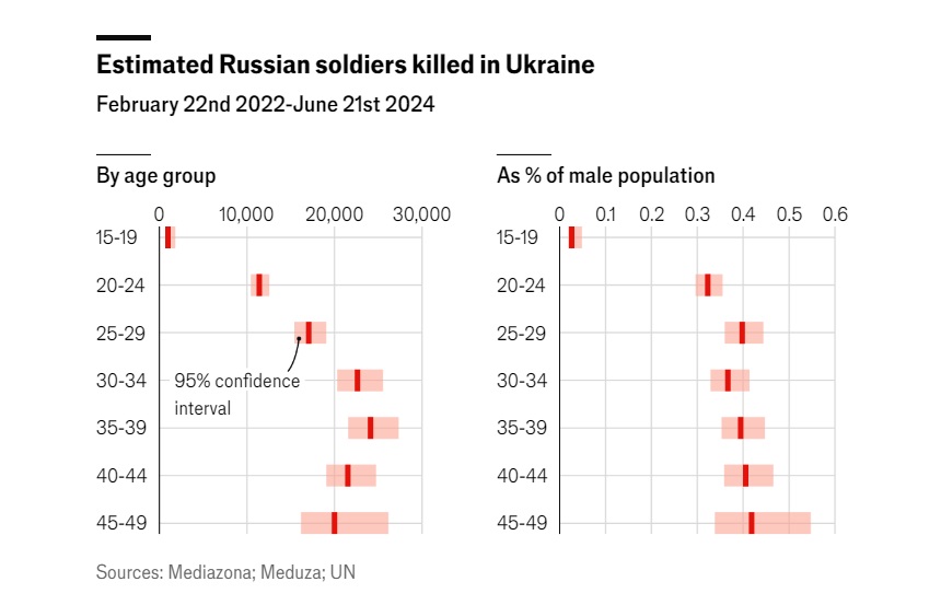 Найбільші втрати зафіксовано серед вікової групи 35-39 років, але у відсотковому співвідношенні найбільше постраждала група 45-49 років. Приблизно 2% усіх російських чоловіків віком від 20 до 50 років могли бути або вбиті, або важко поранені в Україні.