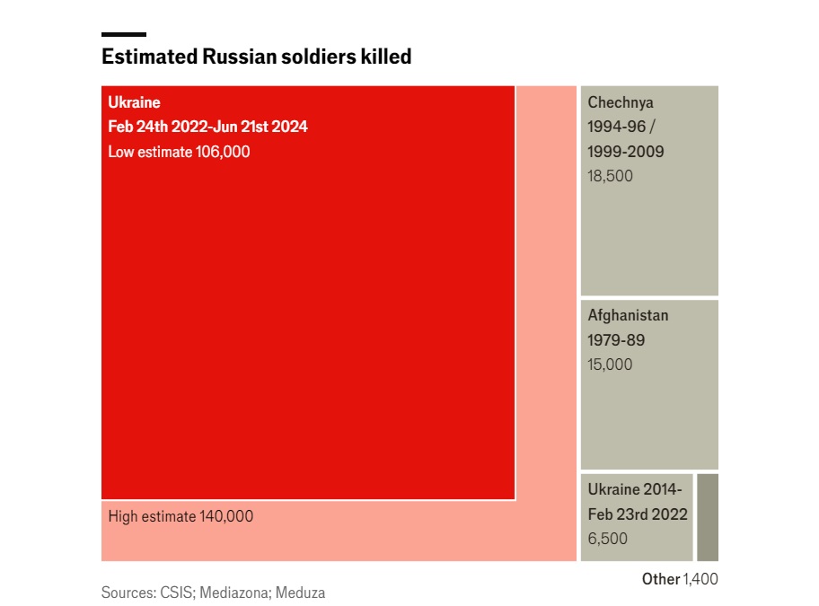 Згідно з останніми даними, опублікованими 5 липня такими російськими ЗМІ як "Медіазона" та "Медуза", кількість загиблих російських військових перевищила критичну позначку в 100 000 осіб. Станом на 21 червня ця цифра, за їхніми оцінками, становила від 106 000 до 140 000 загиблих.
