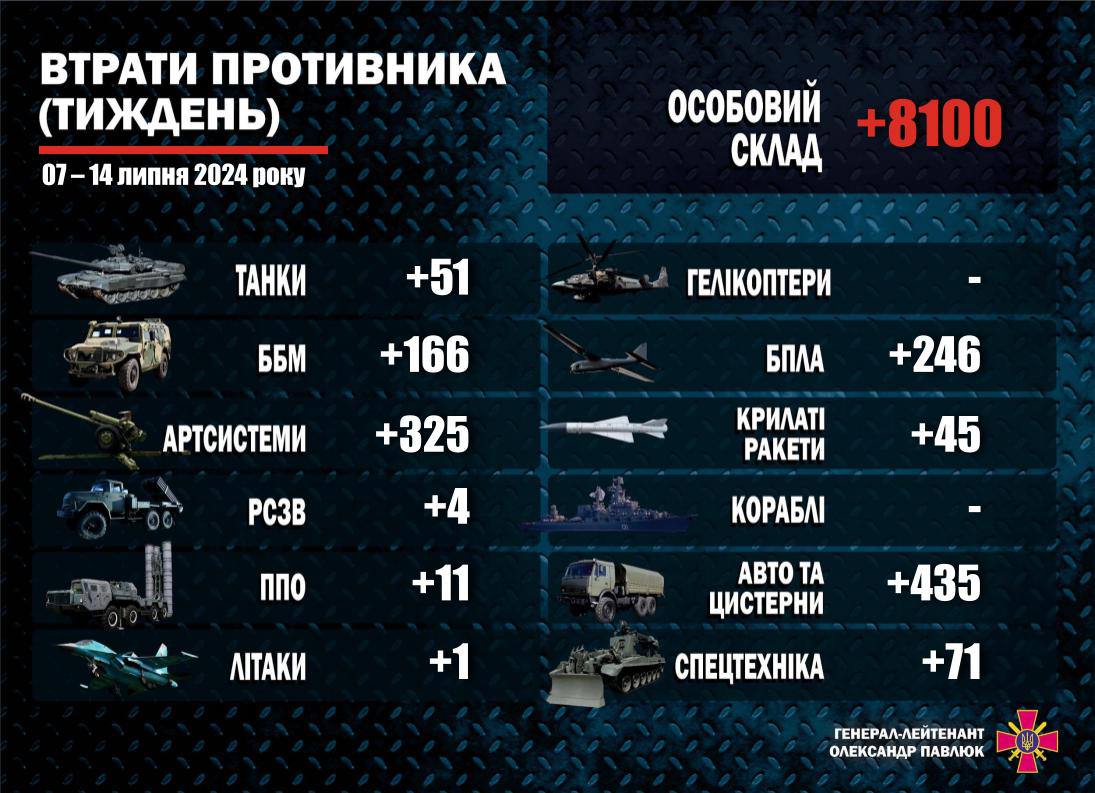 Загальні бойові втрати противника з 08.07 по 14.07 орієнтовно склали: